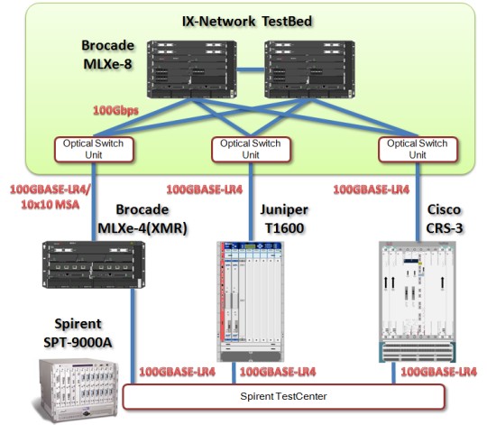 MF, IIJ and NTT Com interconnected routers and switches capable of 100 Gigabit provided by Brocade, Cisco and Juniper and tested the interoperability of physical and network layer, interoperability with optical switch, routing exchange and redundant IX topology while exchanging 100 Gigabit traffic.