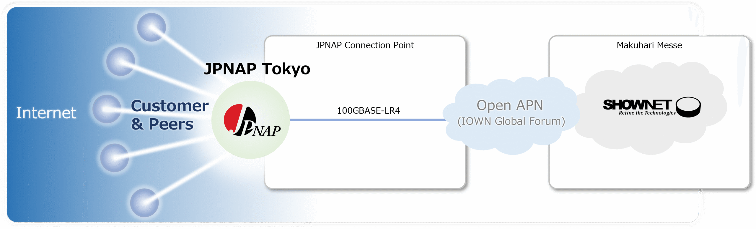 TOKYO, JAPAN- 14th June 2023- INTERNET MULTIFEED CO. (Multifeed), the provider of JPNAP, one of Asia’s largest internet exchanges (IX1) has provided IX connectivity for ShowNet2, built at the "Interop Tokyo 2023 (Venue: Makuhari Messe, Dates: June 14-16, 2023)", using the all-photonics network (APN3) which is known as one of the key technical areas of the IOWN Initiative4. This IX connection links a special and ephemeral set of APN equipments5 provided by contributors of ShowNet to JPNAP Tokyo from the HotStage, a period for testing interoperability of advanced network technologies before the event, until the final day of the exhibition. ShowNet operates them as part of the carrier backbone connecting to the Internet for exhibitors and visitors.