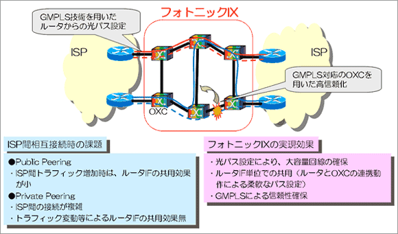 年々増加するトラフィックに柔軟に対処するための新たなアーキテクチャとして、 フォトニックIXの実現を目指し共同検討を行なって来ました。フォトニックIXは、 従来のISP、IXが運用してきたIPルータやL2スイッチと、今回NTTが新たに開発した GMPLS対応OXCとを連携動作させるアーキテクチャがポイントです。IXにおいてISPの IPルータ間のトラフィックが増加してくると、IPルータの入出力インタフェースを 複数まとめて使うようになり、インタフェースの帯域内での木目細かい切替え (IPルーティング)だけではなくインタフェース単位での切替えが必要となってきます。 その場合に、IPルーティングとOXCを用いた光パス※4切替えとを連携動作させることで 、トラフィックの増加に効率的に対処することができます。