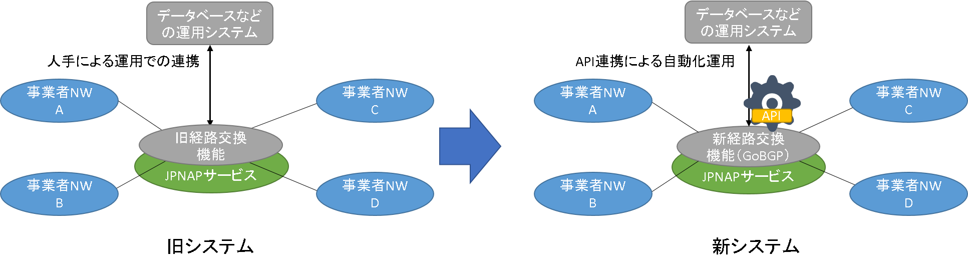 日本電信電話株式会社(本社:東京都千代田区、代表取締役社長:鵜浦 博夫、以下:NTT)とインターネットマルチフィード株式会社(本社:東京都千代田区、代表取締役社長:鈴木 幸一、以下:MF社)は、NTTがOSS(オープンソースソフトウェア)として開発するインターネットの経路制御機能を提供する「GoBGP」をMF社が提供するインターネット・エクスチェンジ(IX)[1]サービスであるJPNAPへの適用に向けて連携を行い、商用導入を実現いたしました。GoBGPの自動化機能を活用し、JPNAPのRouteFEEDサービス[2]の運用の自動化を実現することで、RouteFEEDサービスの新規契約におけるリードタイムを10分の1、既存のお客さまからの設定変更オーダーのリードタイムを30分の1に短縮しました。運用自動化により、従来の手動の設定変更でのヒューマンエラーによるトラブルを防ぐことができ、当該運用稼働も10分の1程度に削減することが出来ます。GoBGPのIX事業者向けの商用導入はJPNAPが世界初となります。なお、この成果は、2016年10月にスリランカで開催されるアジアパシフィック地域のIX事業者の会議(APIX [3])で報告いたします。