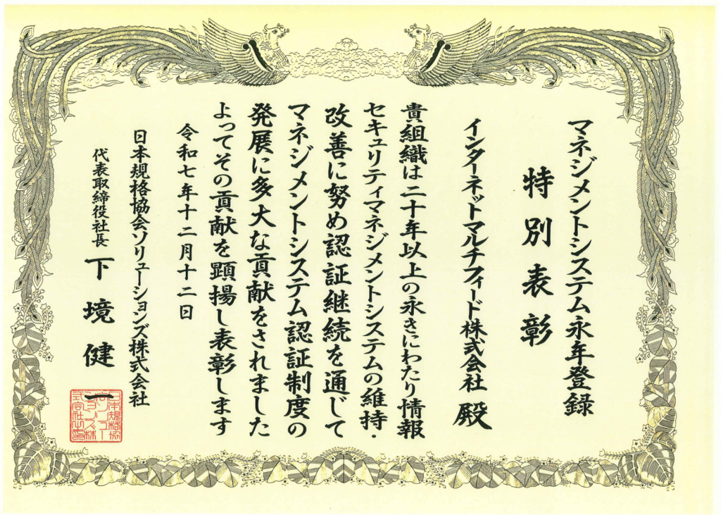 インターネットマルチフィード株式会社(以下、当社という)は、この度、日本規格協会ソリューションズ株式会社より、ISO27001(ISMS)の「マネジメントシステム永年登録(特別表彰)」を受賞いたしました。